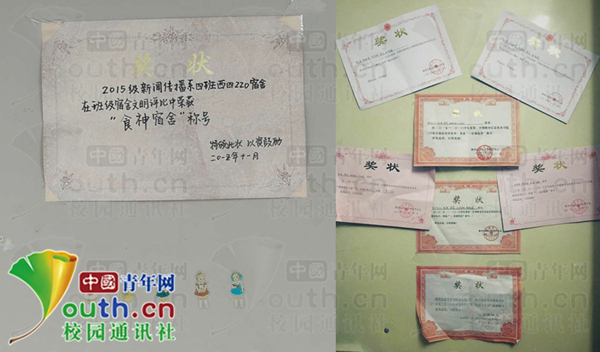 在華南師范大學的學生宿舍中,貼滿了獎狀的門貼更是“吸粉”無數。說到這個門貼,該宿舍同學楊承煜告訴記者,門上的獎狀都是宿舍四個人一起獲得的。一開始是因為宿舍氛圍比較好,大家都比較好學,也對宿舍衛生比較上心,所以在幾次評比中都獲了獎。