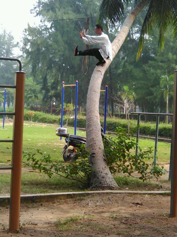 “海南大學內驚現神人,椰子樹上練功!苯眨@樣一則圖片內容在網上火了。從照片看,練功者為一白衣男子,其先在草地上練功,隨后鏡頭轉到距離地面有四五米高的椰子樹上,白衣男子在樹上練功,時而金雞獨立,時而單腿蹲坐,一招一式鎮定自若,頗有大家風范。