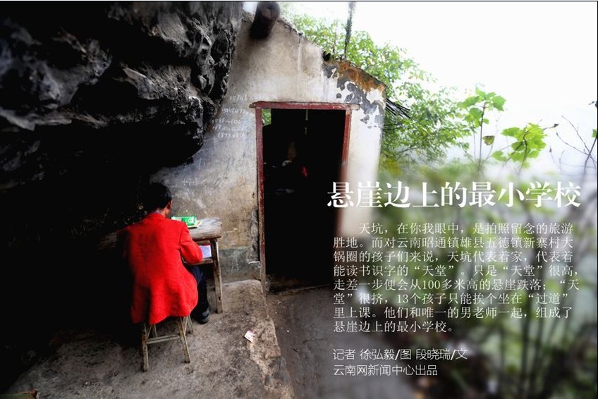 大鍋圈位于云南昭通鎮(zhèn)雄縣五德鎮(zhèn)新寨村,屬天然“天坑”,平均深度120米,最深處達150米,絕壁陡峭險峻。教室不遠處僅有的空地便是孩子們課間玩樂的場所,與記者的小心翼翼相比,孩子們面對懸崖早已習(xí)以為常。