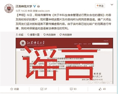 8月20日上午,一條截圖在微信朋友圈迅速傳開。截圖顯示是江蘇師范大學官網發布的一條通知,通知稱校方共2016年第二學期開始,可以申請男女合住。由于該內容已在比較廣的范圍進行傳播,我校將保留追究造謠者法律責任的權利。