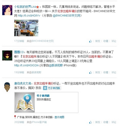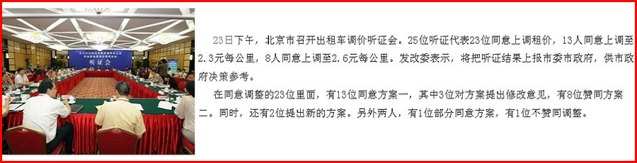 對于北京出租車調價一事,市發改委副主任劉印春表示,下一步,將把聽證會上的意見建議向市委市政府匯報,作為價格調整工作決策重要的參考,最終由市政府決策。不過北京北京出租車的調價幾乎已成定局。 25位代表,明確表示反對意見的僅有1人。是漲價切實應該?微博上對于出租車漲價持反對意見的聲音卻明顯與聽證結果不同。多位網友與評論員均認為,出租車司機收入低,根源并不在低價上,漲價也不能理想化的解決所有問題。這幾乎成了微博上的主流聲音。那么,為何聽證會的結果會同這些聲音出現“岔路”? |