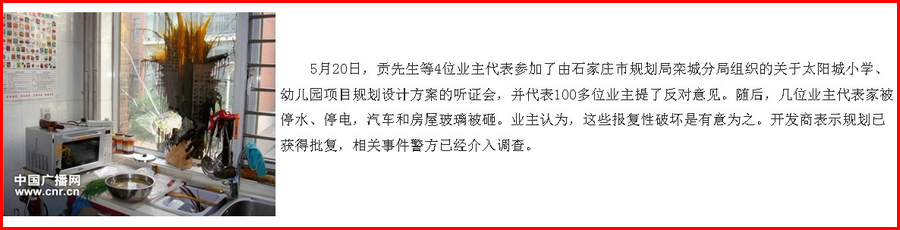 巧合的是,就在幾天之前,在河北欒城,4位業主代表參加了由石家莊市規劃局欒城分局組織的關于太陽城小學、幼兒園項目規劃設計方案的聽證會,并代表100多位業主勇敢的提了反對意見。令人驚訝的是,本該自主表達民意的舞臺,卻出現不和諧的場景。提出反對意見的業主代表慘遭報復,甚至連家都不敢回。——民意與代表意見出現明顯不同,是代表沒當好,還是代表不敢說不好? |