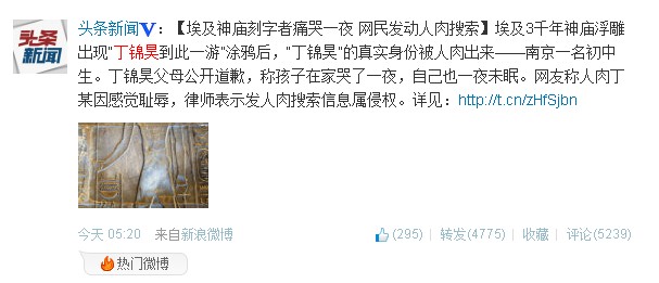 當我們回過頭來再思考一下整個事件,對于丁錦昊而言,無疑他犯了錯誤,他讓有3500年歷史的盧克索神廟在哭泣了,在丁錦昊與它那場跨越千年的對話中它蒙羞了,它已走過了三千多年的漫長歲月,在公元2013年卻被刻上了永不可抹去的傷痕。但之后網友的人肉搜索和口誅筆伐對于一個13歲的孩子是否過于殘忍了?