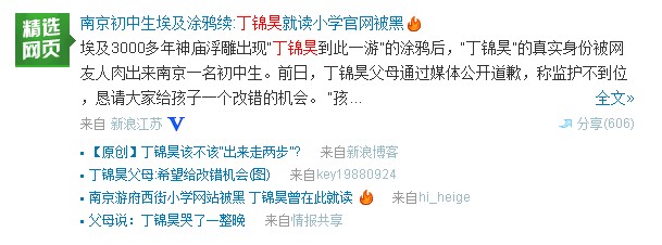 在5月24日丁錦昊“到此一游”事件曝光后,輿論引起軒然大波。至5月25日晚11點,評論已達11000多條,轉發達到83000多條,網上的相關評論則達數十萬條,而主題詞就是中國游客的“素質”。在譴責這種不文明行為的同時,也有網友“人肉”出,丁錦昊是南京某中學在讀的初一學生等個人信息。而網友對于丁錦輝的聲討更是一浪高過一浪。 5月25日,丁錦昊的父母主動站出來發聲,在為孩子的行為道歉的同時,也懇請得到改正的機會,并透露,題字風波發酵后,孩子哭了一整夜。至此,丁錦昊“到此一游”事件算是暫時告一段亂。