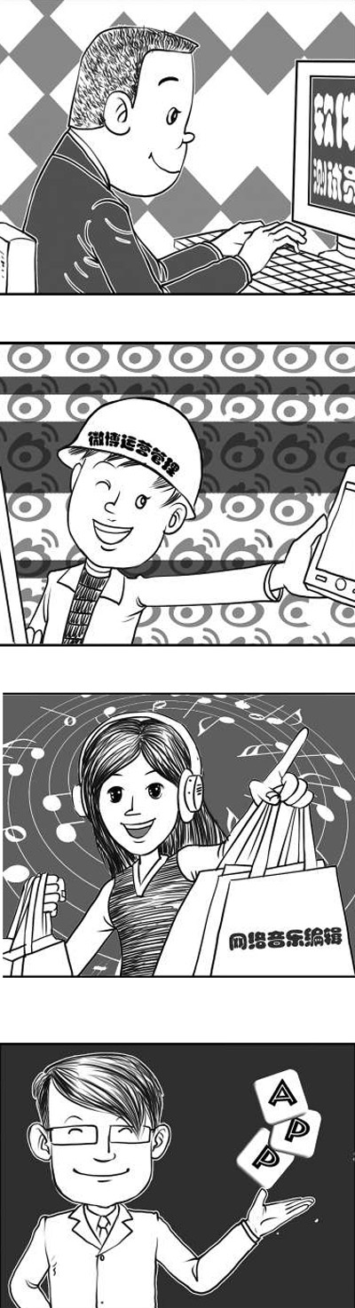 這些互聯網新職業中,如本文提到的數字媒體藝術專業人員、計算機軟件測試員等崗位已相對成熟,開始進入社會分工層面;有的新職業則出現不久,還要經歷挑戰與考驗。比如,收納師,通過網絡展示、咨詢家庭收納設計,還可以上門,幫助客戶充分利用家庭空間;網游陪練,陪游戲玩家打網絡游戲,幫助提升技術和游戲等級;App技術開發工程師,專門為App設計編寫程序;網店裝修師,專業為網店裝飾提供視覺建議和服務,等等。