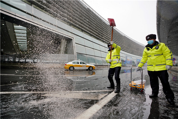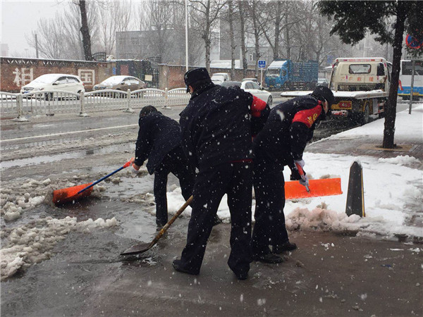 北京南站交警隊安排專人值守站區高架橋梁、急彎等危險路段,及時對結冰路段拋灑融雪鹽,對路面積雪進行不間斷清除,確保進站道路正常通行。
