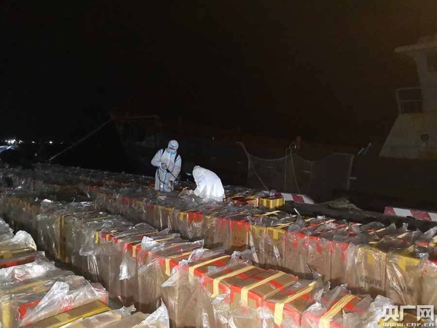 查獲的嫌疑船只與走私香煙(央廣網發 通訊員供圖)