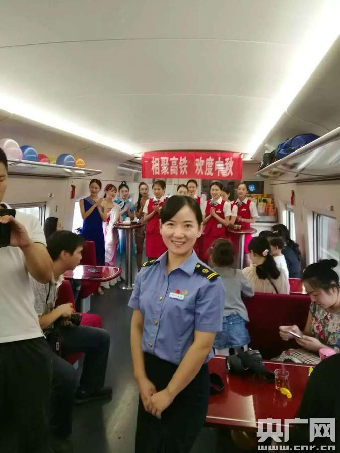 央廣網武漢9月15日消息(記者張毛清 通訊員劉衛兵)今天(15日)是傳統節日中秋節。當歸心似箭、回家團聚的人們登上由武漢開往深圳北的G77次列車時,沒有料到會趕上武漢客運段的乘務員們精心準備的一場別樣中秋聯歡會。