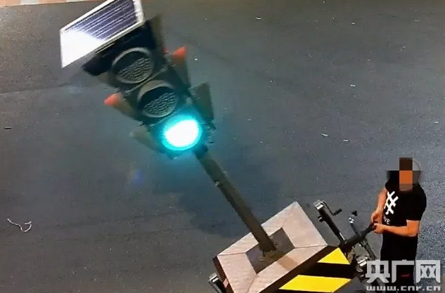 男子凌晨扳倒紅綠燈。(央廣網發 汕頭交警供圖)
