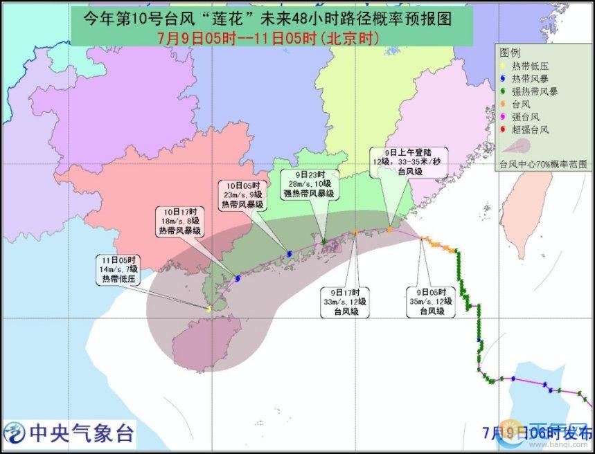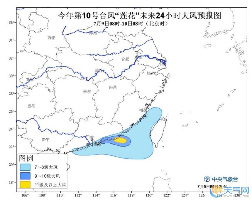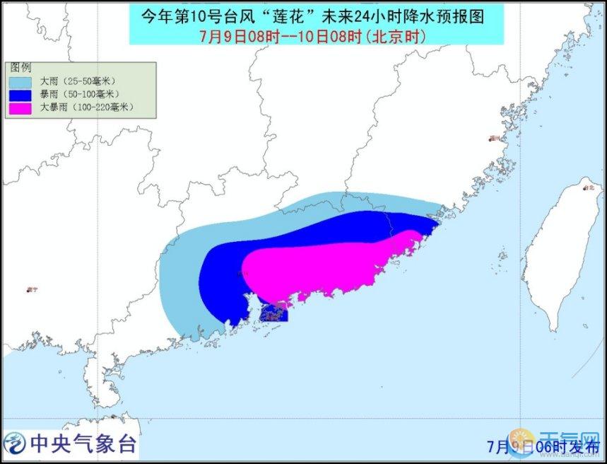 7月9日08時至7月10日08時,內蒙古東部、四川盆地西北部、川西高原南部、云南中西部、湖北東部、江西南部、福建南部、廣東、臺灣等地的部分地區有中到大雨,其中,廣東東部、福建東南部、臺灣北部的部分地區有暴雨或大暴雨(100~220毫米),上述局地將伴有短時雷暴大風等強對流天氣。南海東北部有7~9級大風,“蓮花”中心經過的附近海域風力10~12級、陣風13~14級。