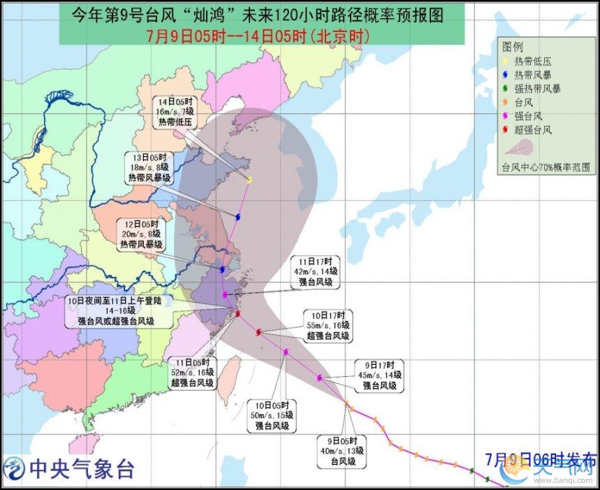 預計,“燦鴻”將以每小時20公里左右的速度向西偏北方向移動,強度繼續加強,將于10日白天進入東海東南部海面,最強可達超強臺風級(16-17級,52-58米/秒) ,然后逐漸向浙閩一帶沿海靠近,并有可能于10日夜間至11日上午登陸上述沿海地區,登陸強度可達強臺風級或超強臺風級(14-16級,45-52米/秒)。