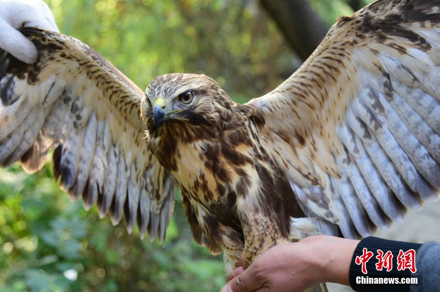10月14日,河南鄭州,市民吳先生將一只灰褐色大鳥送到鄭州市林業局野生動物救護站。這只大鳥全身羽毛呈灰褐色,雙眼圓睜,尖嘴利爪,翅膀展開足有1.5米長。只要見人靠近,便展開翅膀,非常兇猛。專家鑒定該鳥為國家二級重點保護動物。 圖片來源:CFP視覺中國