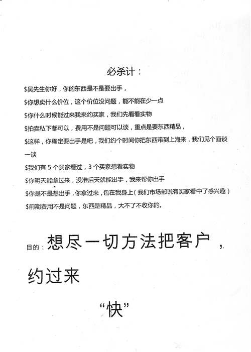 除了對外宣傳,該公司還雇傭了大量員工,通過網絡論壇、電話或微信尋覓被害人,用免費展示、高價代售等方式吸引了不少收藏愛好者。據事后了解,該公司給每位員工提供一份“話術單”,上面一步步地注明了如何招攬客戶,只要按照話術單操作,成功率能大大提高。