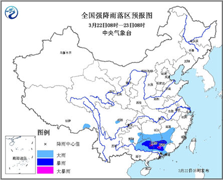 中國天氣網訊 中央氣象臺3月22日06時繼續發布暴雨藍色預警: