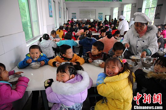 資料圖:學生們正在新建的學生食堂吃著營養午餐。 中新社發 劉杰華 攝