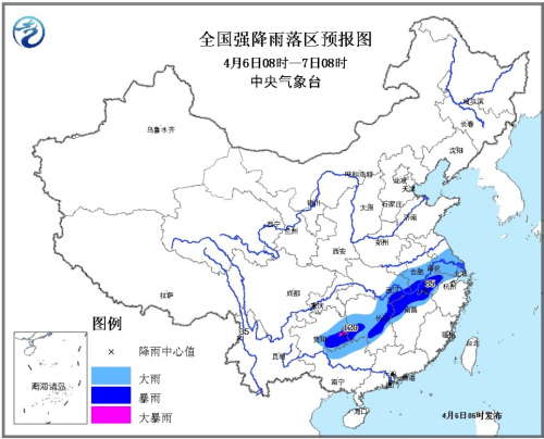 預計,6日08時至7日08時,湖北東部、安徽中南部、江蘇中南部、上海、浙江北部、江西北部、湖南中部和東北部、貴州東南部、廣西北部等地有大雨,其中,安徽南部、湖北東南部、江西北部、湖南中部和東北部、貴州東南部等地的部分地區有暴雨,局地大暴雨(100~120毫米);上述部分地區有短時強降水,最大小時雨強20~40毫米,局地伴有雷暴大風或冰雹。中央氣象臺4月6日06時繼續發布暴雨藍色預警。