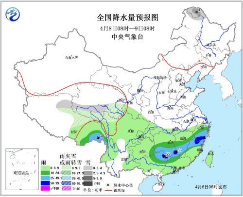 8日08時至9日08時,西藏北部、青海中南部、黑龍江西北部等地的部分地區有小雪(雨)或雨夾雪,局地有中雪;西藏東南部、云南西北部、貴州東南部、江南中南部、華南北部等地的部分地區有中到大雨,局地有暴雨(50~55毫米)。內蒙古中東部、東北地區西部等地有4~6級風。