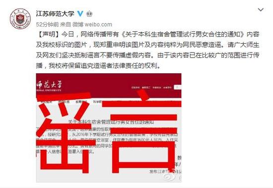 現代快報訊(記者 李偉豪)8月20日上午,一條截圖在微信朋友圈迅速傳開。截圖顯示是江蘇師范大學官網發布的一條通知,通知稱校方共2016年第二學期開始,可以申請男女合住。不過,很快,該校便通過官方微博辟謠,表示此為惡意造謠,保留追究造謠者發了責任的權利。