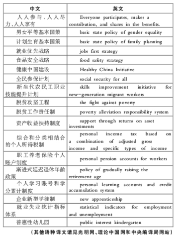 編者說明本期圍繞共享發展主題,從《中共中央關于制定國民經濟和社會發展第十三個五年規劃的建議》(以下簡稱《建議》)中挑選了18條術語,涉及共享發展的實施戰略以及包括脫貧攻堅、就業創業、社會保障、教育教學改革、人口均衡發展等方面的政策舉措。《建議》已由我局翻譯成英、俄、法、西、日、德、阿等七種外文,并由中央編譯出版社出版發行。