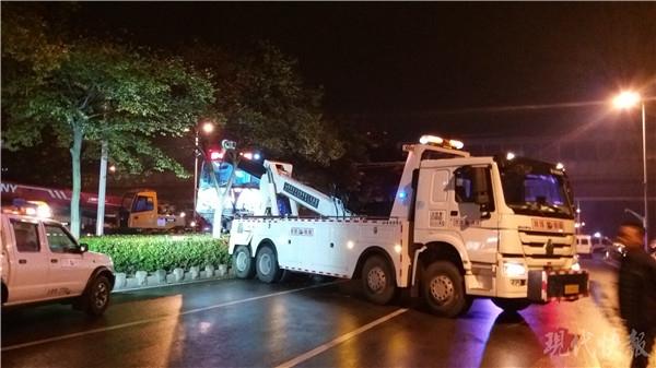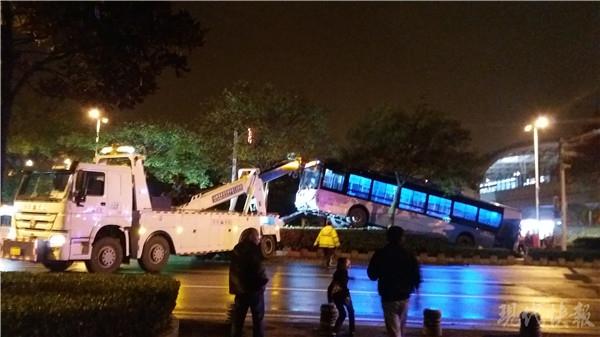 晚上7點50左右,現代快報記者在現場看到,事故發生在地鐵二號線羊山地鐵站附近的仙境路上,出租車已被救援走,一輛吊車正在把公交車從綠化帶上吊出。事發時,公交車正從學原路·中醫藥大學站開往中醫藥大學站。兩車應該是剛過仙林大道十字路口就發生了撞擊,事故留下的碎玻璃,從在仙境路上由南向北遺落了四五十米。