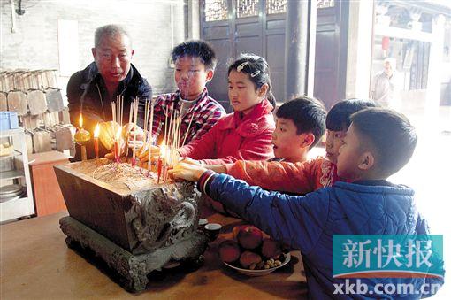 ■番禺區(qū)大龍村里的兒童在老人的帶領(lǐng)下給祖先上香。