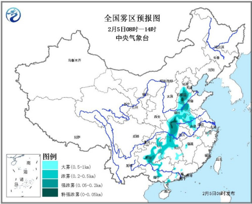 中新網(wǎng)2月5日電 據(jù)中央氣象臺網(wǎng)站消息,中央氣象臺2月5日06時繼續(xù)發(fā)布大霧黃色預(yù)警:預(yù)計,5日早晨至上午,河北南部、河南中東部、山東西部、安徽北部、湖北中部、湖南北部、貴州中東部、廣西中部等地有大霧,其中,河北南部、河南中東部、山東西南部、湖北中部、湖南北部、貴州中部等地的部分地區(qū)有能見度低于500米的濃霧,局地有能見度低于50米的特強(qiáng)濃霧。
