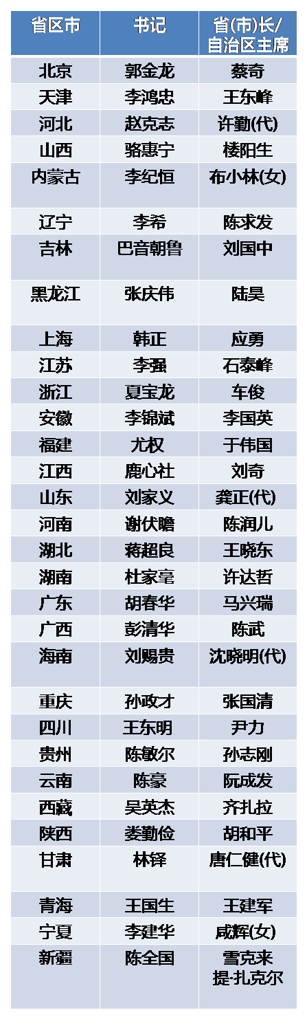 今年1、2月份,省級兩會紛紛召開,11個省區市選出政府“一把手”。分別是蔡奇當選北京市長,劉國中當選吉林省長,應勇當選上海市長,車俊當選浙江省長,李國英當選安徽省長,王曉東當選湖北省長,馬興瑞當選廣東省長,張國清當選重慶市長,阮成發當選云南省長,齊扎拉當選西藏自治區政府主席,王建軍當選青海省長。