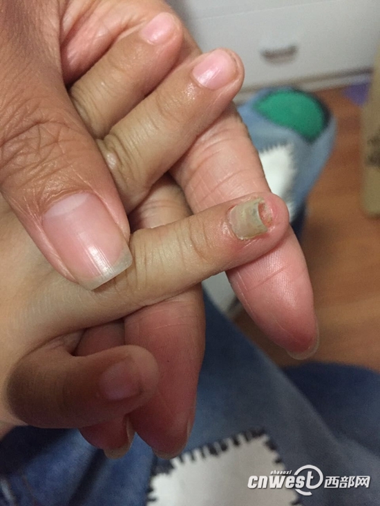 何女士說,“我們跑了幾家醫院后為了讓孩子少受點罪,跟醫生商量選擇保守治療,直到5月4日孩子的整個指甲翻起脫落。”