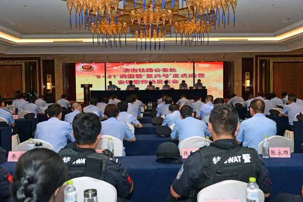 央廣網(wǎng)濟(jì)南9月21日消息(記者于聞 通訊員 張弦)“復(fù)興號(hào)”標(biāo)準(zhǔn)動(dòng)車組9月21日在京滬高鐵正式運(yùn)營(yíng),率先達(dá)到350公里時(shí)速。為確保“復(fù)興號(hào)”的運(yùn)營(yíng)安全,濟(jì)南鐵路公安處提前布局,在泰安召開(kāi)“9·21”調(diào)圖暨“復(fù)興號(hào)”正式運(yùn)營(yíng)安保誓師動(dòng)員大會(huì),濟(jì)南西站派出所干警代表共20人參加了動(dòng)員大會(huì)。大會(huì)號(hào)召全體干警繼續(xù)保持高昂的斗志,不惜一切代價(jià),集中全部精力,戰(zhàn)勝一切困難,確保“復(fù)興號(hào)”正式運(yùn)營(yíng)的絕對(duì)安全。大會(huì)舉行了安保誓師動(dòng)員集體宣誓儀式。
