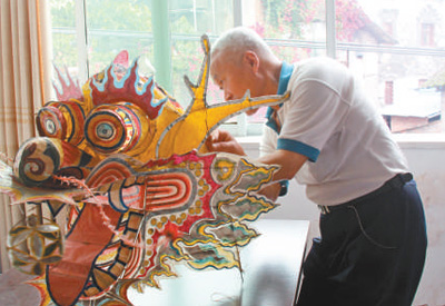 楊興鐘老人在制作龍頭風(fēng)箏。資料照片