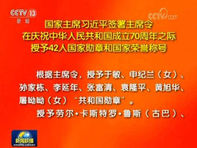 2019年9月17日,國家主席習近平簽署主席令,根據十三屆全國人大常委會第十三次會議表決通過的全國人大常委會關于授予國家勛章和國家榮譽稱號的決定,授予42人國家勛章、國家榮譽稱號。