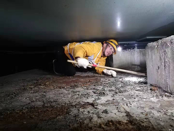此處橋梁和橋墩之間高度僅50厘米。無法站著,甚至無法蹲著,身高1米8的作業(yè)人員楊正胸口貼地,雙肘摩擦爬到支座附近,開始檢查。像這樣的情況很多,在檢查梁體時,作業(yè)人員還需要先下半身坐在梁體橢圓形的檢查門,再將上半身盡力折疊到腿上,最后整個身子推進(jìn)中空的梁體。