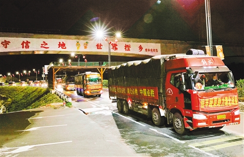 2月15日,滿載江西信豐、龍南兩地30萬斤愛心蔬菜的12輛貨車開往湖北省武漢市,這些蔬菜將配送給武漢一線醫(yī)院及社區(qū)居民。 李 健攝(中經(jīng)視覺)