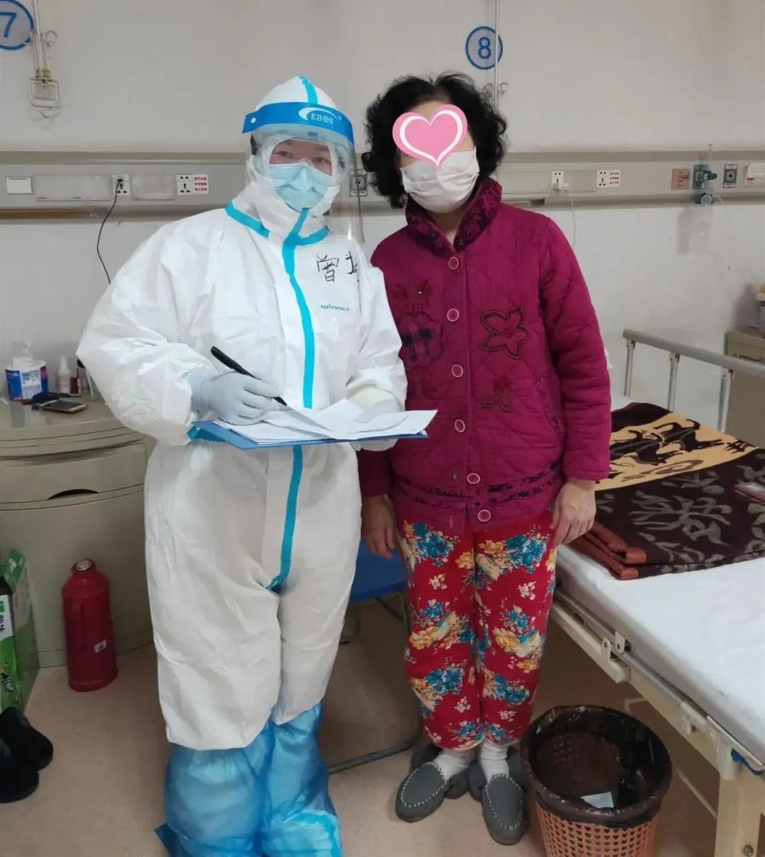 今天工作的時候,我覺得我身后有一個身影,一直跟著我。我轉身一看,一位阿姨就站在我的身后。我趕忙問:“阿姨,您有什么事需要我幫忙嗎?“阿姨說:“我不是你管的病人,看見你們身后寫著河北,我也是河北人。阿姨見到家鄉人了,心里高興。”我知道了她是保定人,已經在這里隔離治療16 天了。她主動要給我拍照片,她說:“雖然現在看不出你什么樣子,但從隔離衣上能知道你們的名字。”