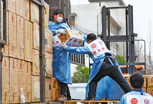 3月3日,武漢市青山區(qū)武糧倉庫,志愿者在搬運捐贈的水果等物資。經(jīng)濟日報-中國經(jīng)濟網(wǎng)記者 高興貴攝
