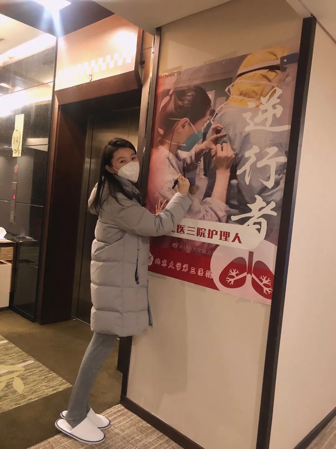 北京大學第三醫院危重醫學科護士張佳男在武漢駐地與張貼的海報合影(2月16日攝)。海報照片拍攝于1月29日凌晨三點,張佳男和隊員們進入華中科技大學同濟醫院中法新城院區隔離病房第一晚,當時張佳男正在給隊友的防護服上寫字。新華社發