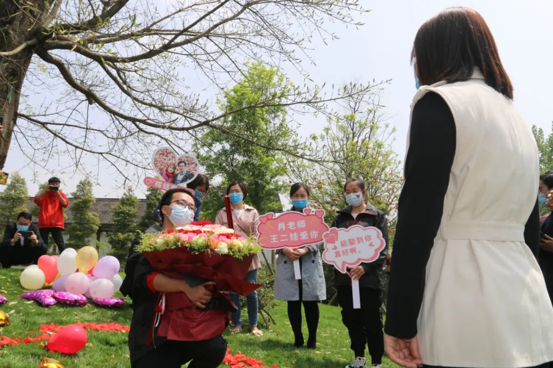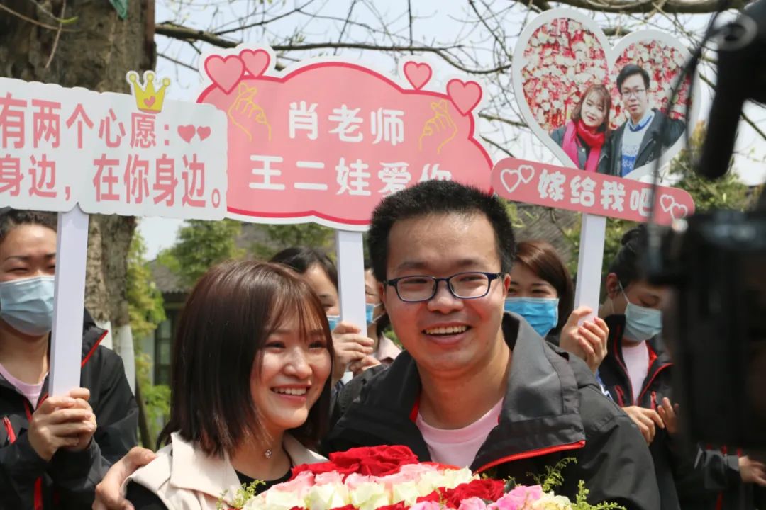 成都醫學院第一附屬醫院重癥醫學科男護士、四川省第三批援湖北醫療隊隊員王旭濤返回四川隔離期滿后第一時間向護士女友肖雪梅求婚(4月14日攝)。新華社發