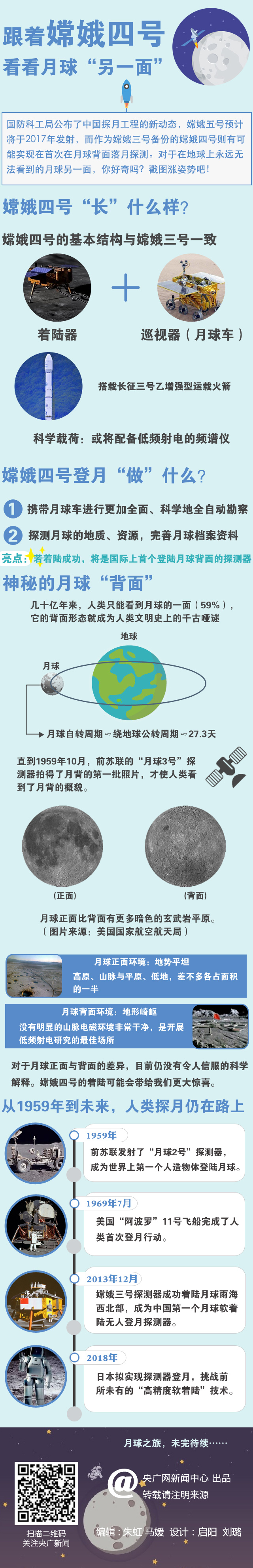 國防科工局公布了中國探月工程的新動態,嫦娥五號預計將于2017年發射,而作為嫦娥三號備份的嫦娥四號則有可能實現在首次在月球背面落月探測。對于在地球上永遠無法看到的月球另一面,你好奇嗎?戳圖漲姿勢吧!