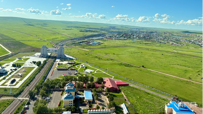 俯瞰位于滿(mǎn)洲里的中俄邊境線,草原廣袤,口岸建筑與鐵路縱橫交錯(cuò)(央廣網(wǎng)記者 李春雪 攝)