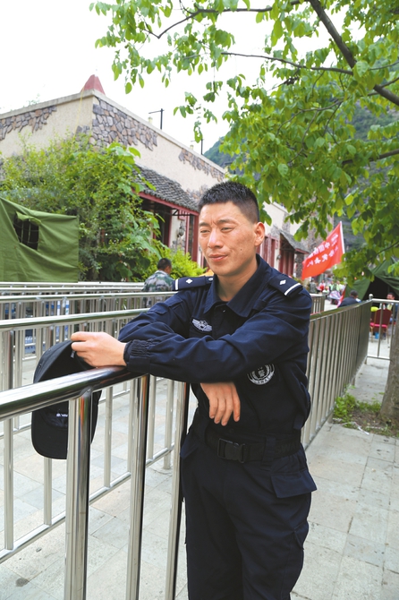 26日上午11點,茂縣疊溪新磨村,陽光射在臉上有點火辣。樹蔭下的鐵護欄旁,剛剛輪換下來的高猛,用帽子扇著風,一臉汗漬。