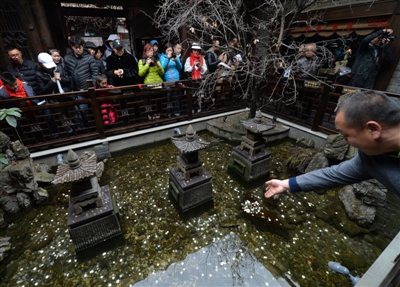 寬窄巷子記憶四川館今年1月中旬正式運營。館內(nèi)古色古香,擺放著各式各樣具有四川特色的茶具、盆景。然而,7日上午10點,記者在館中發(fā)現(xiàn),一處10平米不到的普通水池周圍圍滿了游客。這些游客有的駐足觀看,有的忘情自拍,更有不少游客掏出口袋中的硬幣,將1元、5角、1角硬幣拋向水池,或是瞄準(zhǔn)水池中矗立著的3座燭塔,躊躇滿志打算將硬幣拋在塔頂。