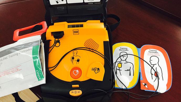 在培訓人員的指導下,記者嘗試了AED 模擬使用:首先,取出并按下電源按鍵后,按照語音提示撕開密封的貼片包裝;第二,其中的黃色與紅色兩片貼片即作用于患者的電極片,根據圖示分別貼于左胸部上方與右胸部下方,并將電極線插入AED相應插口處;第三,機器語音會立即提示“正在分析心律”,并根據實際情況告知應電擊還是繼續人工救護,使用過程不超過1分鐘;需要注意的是,除AED語音提示“離開患者”外,其余時間施救者都應持續進行心肺復蘇(CPR)搶救,保證胸外按壓頻率在每分鐘100至120次。