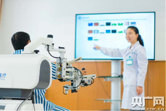 “儀器會先對關節和手握力進行評估,推薦訓練等級,然后通過一個可調節的上臂支持系統和一個三維運動空間,讓患者在虛擬環境中進行功能訓練!睋諣柹祻歪t院神經內科主任、副主任醫師王培良介紹,這套系統的原理有點像家用的體感游戲,配合訓練動作,顯示屏上會反饋患者的動作。