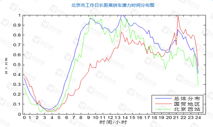 高德地圖聯合清華大學戴姆勒可持續交通研究中心針對拼車(包括順風車)市場進行了研究。研究團隊選取了北京五環內出租車的出行數據(南北向各約30km,共計約809萬次出行,著重考慮起點和終點都在此區域的打車情況),發現工作日不同時段的出行需求重合度很高,拼車潛力巨大。