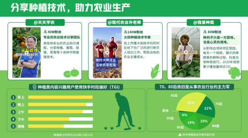 當下的短視頻內容更是覆蓋了有關三農的方方面面,其中記錄農村生活類創(chuàng)作者最愛發(fā)作品,農技知識科普類作品最受歡迎。可以說,通過快手短視頻平臺,讓新一代農人和農村的生產生活有了更真實、更快捷、更多元的呈現(xiàn)。快手在三農報告中舉例,不僅有扶貧書記帶你走進云上人家、趕海美少女帶你體驗海邊的詩與遠方、牧民達西帶你感受草原牧民游牧天邊的生活;還有帶你吃遍全國的西雙版納阿浪、專為大家分享性價比高的產地水果的榴蓮大叔;以及分享園藝知識、種植技術的專業(yè)團隊......