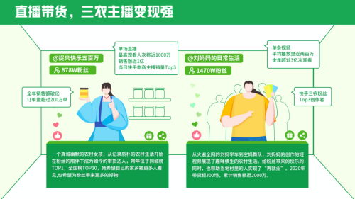 近年來,通過短視頻、直播快速發(fā)展的農村電商、農產品推廣等新形式,正在為農業(yè)實體經濟塑造了便捷有效的護航“軟件”,而在過去一年,快手三農也結合自身產品優(yōu)勢,全方位為農民和農村經濟賦能。報告中顯示,目前每兩位快手三農創(chuàng)作者就有一位在快手獲得收入,2020年三農創(chuàng)作者電商成交單數(shù)超過5000萬。