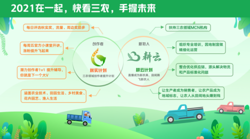 在日前舉辦的快手三農創(chuàng)作者大會上,平臺提出2021年將圍繞創(chuàng)作者及新農人將實行的“秋實計劃”和“耕耘計劃”——“秋實計劃”是指三農領域創(chuàng)作者提升計劃,而“耕耘計劃”即讓直播成為新農具,通過扶持三農領域MCN機構、組織專業(yè)培訓、整合優(yōu)化供應鏈等方式,讓生產者成為銷售者,讓農產品成為地域標志,讓農人從田間地頭賺到錢。