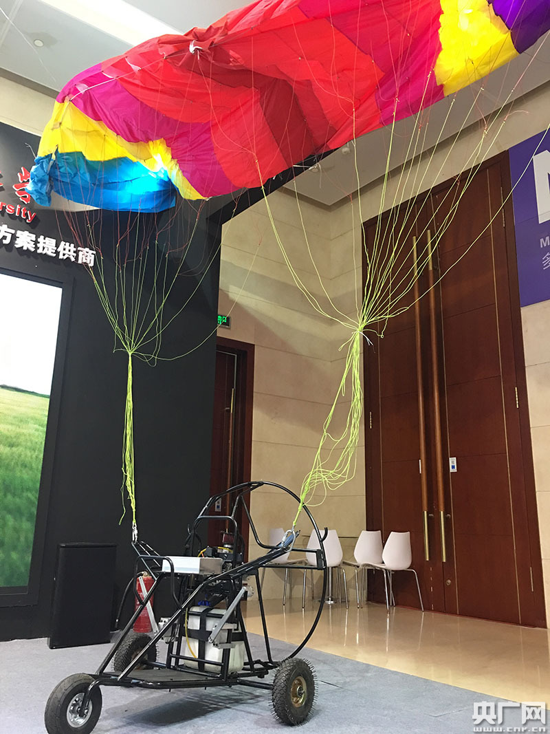 無人動力傘,用于電力巡檢的無人動力傘飛行里程長,速度慢,更方便進行定點拍攝。一飛智控科技的參展商小杜介紹,動力傘的原理是用無線電來操縱傘繩讓它按著既定的路線飛行,通過傘繩的牽引控制它的上升下降、轉(zhuǎn)彎、速度。飛起來以后通過動壓向傘里充氣,傘就形成了可以提供升力的載體,于是可以把下面的小車給吊起來。動力傘上裝有攝像頭,目前好多要交付的動力傘是用于農(nóng)業(yè)。