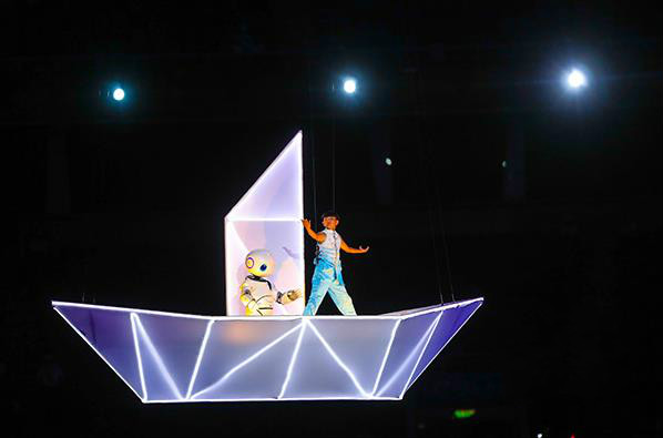 比如《逐夢遠航》是從五個方面來把握天津元素的。首先展演中呈現了古運河、海河、天津城市景觀等元素,反映了海河兩岸的歷史變遷,表達了我們對這片熱土的深情厚愛,比如開幕式上的海河浪花團體操,在飛濺的水珠中體現了很多當代體育的圖像,寓意天津的海河孕育出的體育精神。其次是歷史因素,天津是近代以來中國的縮影,有“中華百年看天津”之說,天津人民有著自新圖強光榮傳統和建設祖國復興民族的強烈意志,開幕式上霍家拳的表演,它傳遞的精忠報國的精神和精衛鳥鍥而不舍的精神,是中華民族復興的強大動力。然后是文化藝術因素,天津有著濃郁的文化特色,比如漕運文化、楊柳青年畫等等標志性元素也融入了開幕式當中。