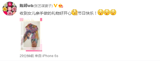 今日(3月8日),張藝謀的妻子陳婷在微博曬出一條漂亮絲巾,并附言稱:“收到女兒親手做的禮物好開心,節日快樂!”